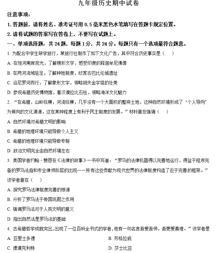 - 江苏省苏州市姑苏区2024-2025学年九年级上学期期中考试历史卷(含答案) 2025-09-21
