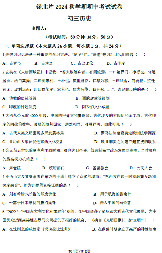 江苏100教学资源网 九上 江苏省无锡市锡北片2024-2025学年九年级上学期期中考试历史试题(含答案) https://www.jiangsu100.com/14553.html