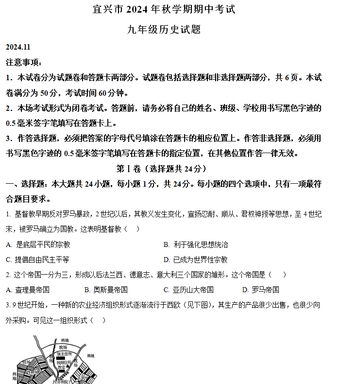 江苏100教学资源网 九上 江苏省无锡市宜兴市2024-2025学年九年级上学期期中历史试题(含解析) https://www.jiangsu100.com/14559.html