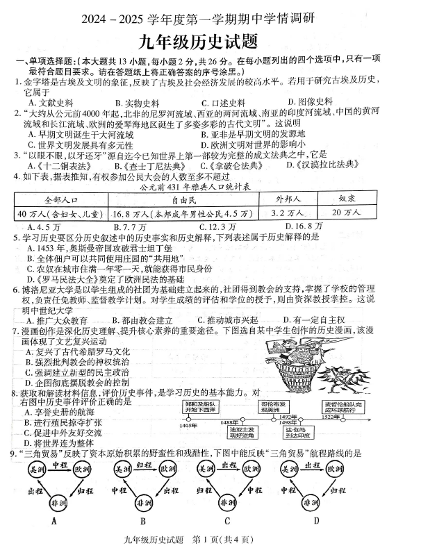 江苏省徐州市丰县2024-2025学年部编版九年级上学期历史期中检测题(含答案)