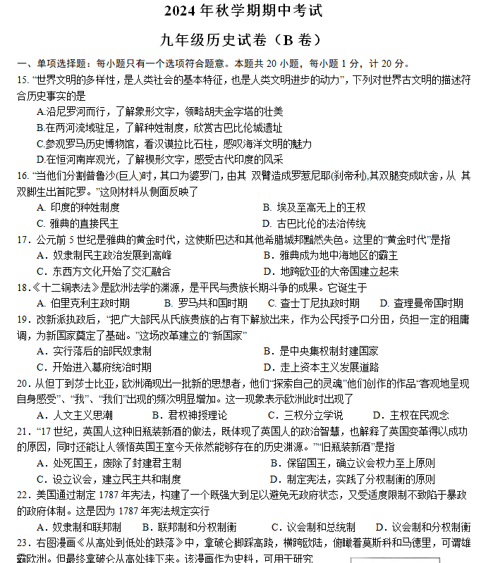 江苏100教学资源网 九上 江苏省盐城市射阳县实验初级中学2024-2025学年九年级上学期期中考试历史试题(B) (含答案) https://www.jiangsu100.com/14592.html