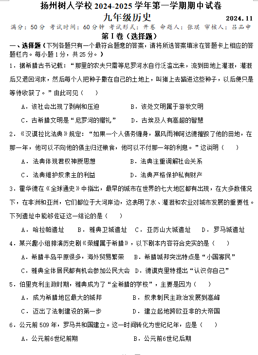 江苏100教学资源网 九上 江苏省扬州中学教育集团树人学校2024~2025学年九年级上学期期中历史试题(含答案) https://www.jiangsu100.com/14619.html