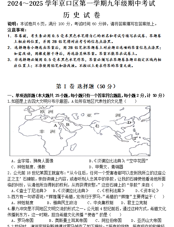江苏100教学资源网 九上 江苏省镇江市第十中学2024-2025学年部编版九年级上学期11月期中考试历史试题(含答案) https://www.jiangsu100.com/14622.html