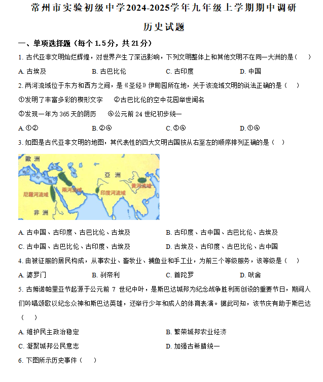 江苏100教学资源网 九上 江苏省常州市实验初级中学2024-2025学年九年级上学期期中调研历史试题(含答案) https://www.jiangsu100.com/14625.html