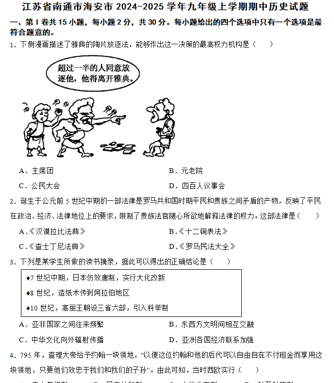 江苏100教学资源网 九上 江苏省南通市海安市2024-2025学年九年级上学期期中历史试题(含答案) https://www.jiangsu100.com/14634.html