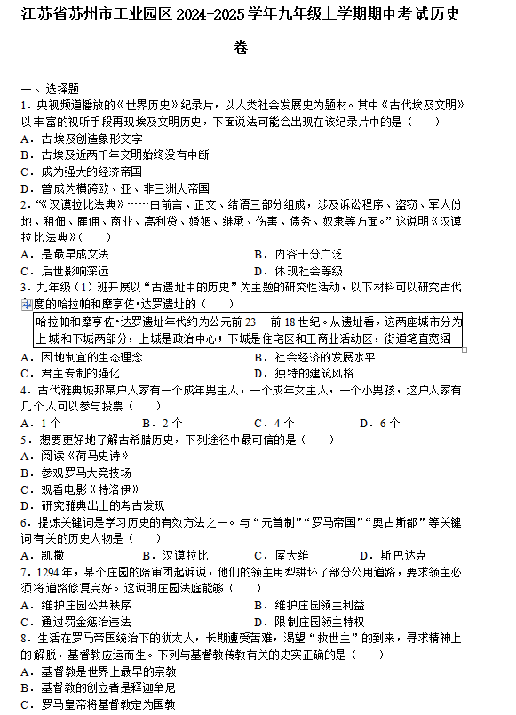 江苏100教学资源网 九上 江苏省苏州市工业园区2024-2025学年九年级上学期期中考试历史卷(含答案) https://www.jiangsu100.com/14640.html