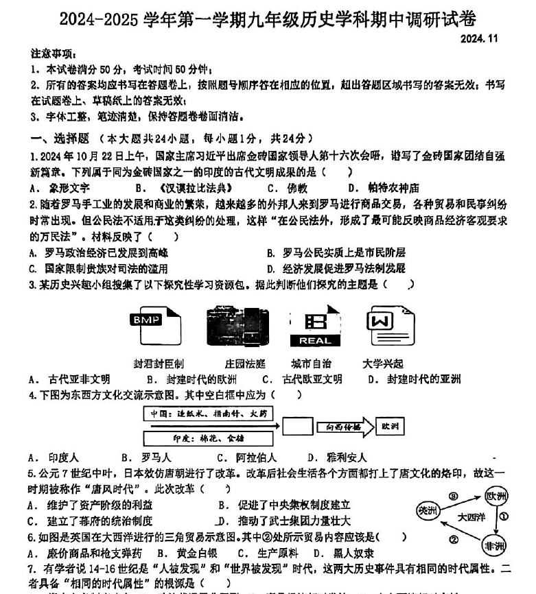 江苏100教学资源网 九上 江苏省苏州市工业园区唯亭学校2024-2025学年部编版九年级历史上学期期中调研试卷(含答案) https://www.jiangsu100.com/14643.html