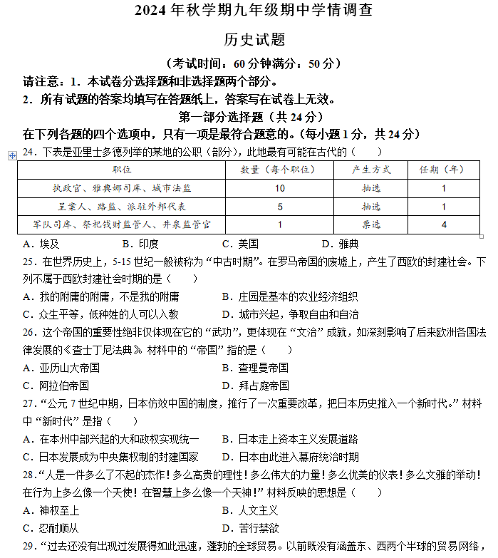 - 江苏省苏州市姑苏区2024-2025学年九年级上学期期中考试历史卷(含答案) 2025-09-21