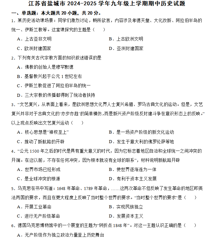 江苏100教学资源网 九上 江苏省盐城市2024-2025学年九年级上学期期中历史试题(含答案) https://www.jiangsu100.com/14664.html