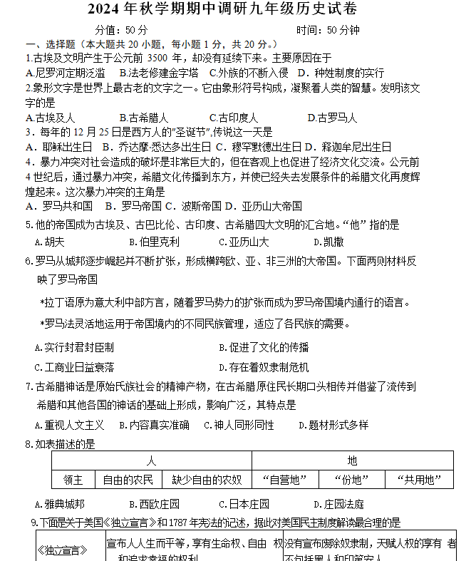 - 江苏省苏州市姑苏区2024-2025学年九年级上学期期中考试历史卷(含答案) 2025-09-21