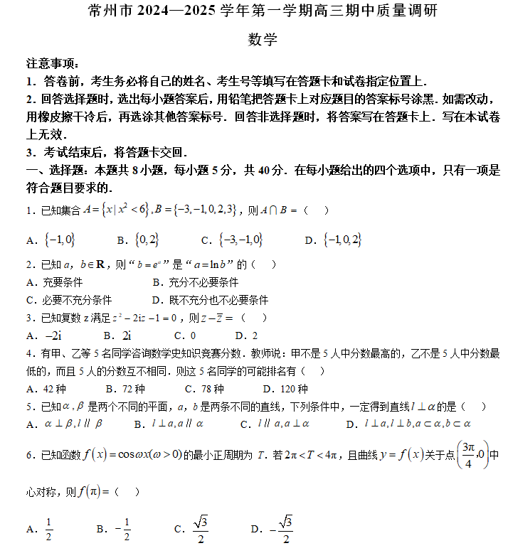 江苏100教学资源网 高三上 江苏省常州市2024-2025学年高三上学期期中质量调研数学试题(含解析) https://www.jiangsu100.com/14997.html