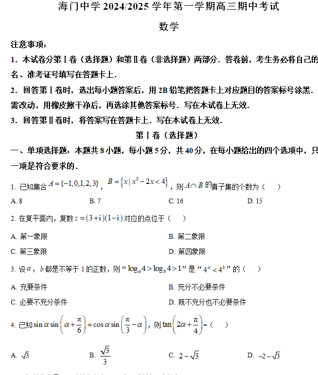 - 江苏省南通市2024-2025学年高三上学期期中考试数学试题(含答案) 2025-09-26