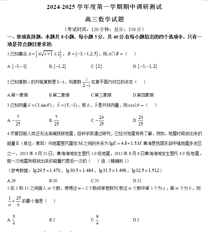 江苏省泰州市泰兴市多校联考2024-2025学年高三上学期11月期中调研测试数学试题(含解析)