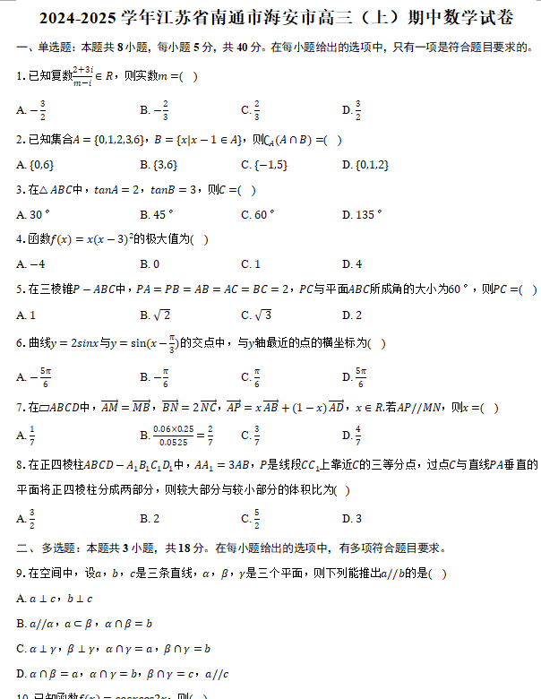 - 江苏省南通市2024-2025学年高三上学期期中考试数学试题(含答案) 2025-09-26