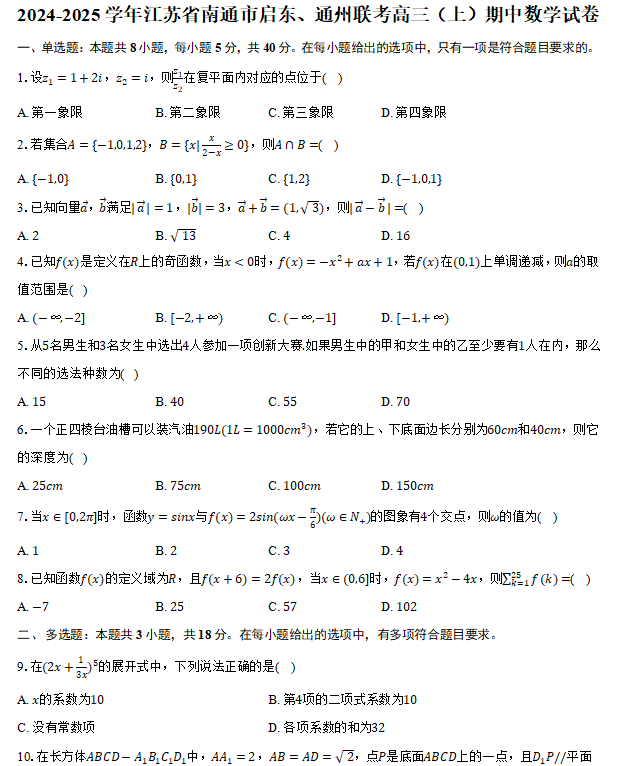 - 江苏省南通市2024-2025学年高三上学期期中考试数学试题(含答案) 2025-09-26