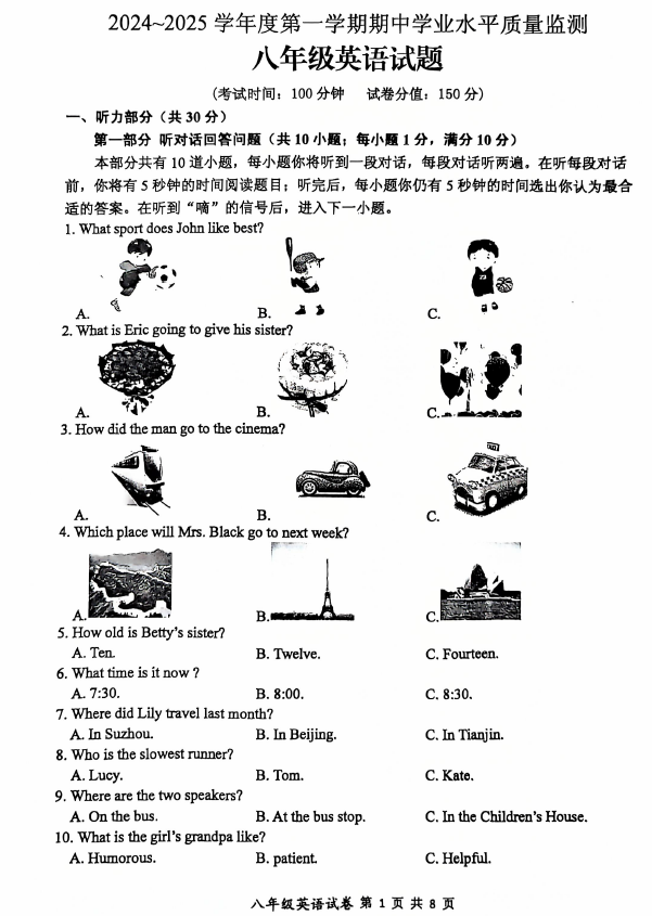 - 江苏省宿迁市泗阳县2024-2025学年八年级上学期期中英语试题(含答案+听力音频) 2025-10-11