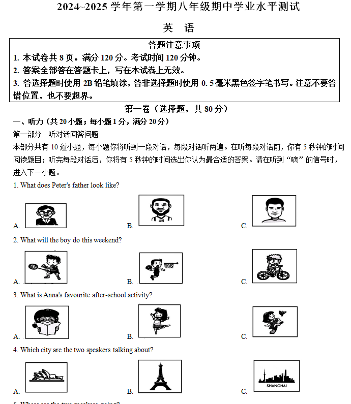 江苏100教学资源网 八上 江苏省宿迁市泗阳县2024-2025学年八年级上学期期中英语试题(含答案+听力音频) https://www.jiangsu100.com/15385.html