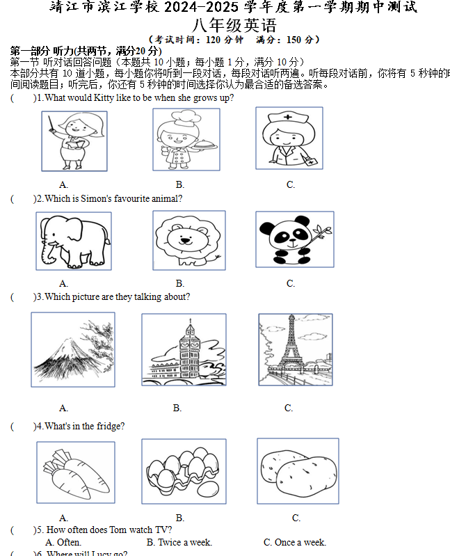 江苏100教学资源网 八上 江苏省泰州市靖江市滨江学校2024-2025学年八年级上学期期中考试英语试卷(含答案+听力音频) https://www.jiangsu100.com/15404.html
