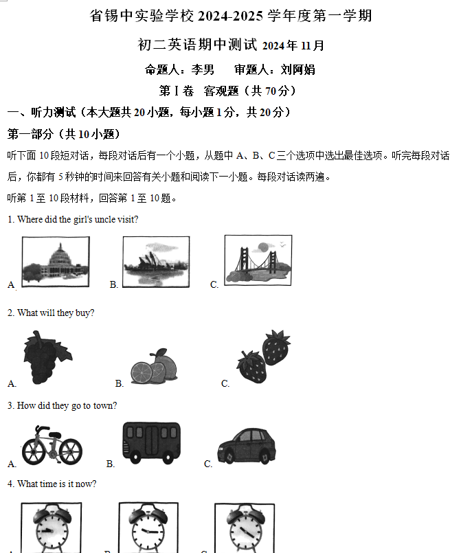 江苏100教学资源网 八上 江苏省无锡市惠山区省锡中实验学校2024-2025学年八年级上学期期中考试英语试卷(含解析) https://www.jiangsu100.com/15419.html