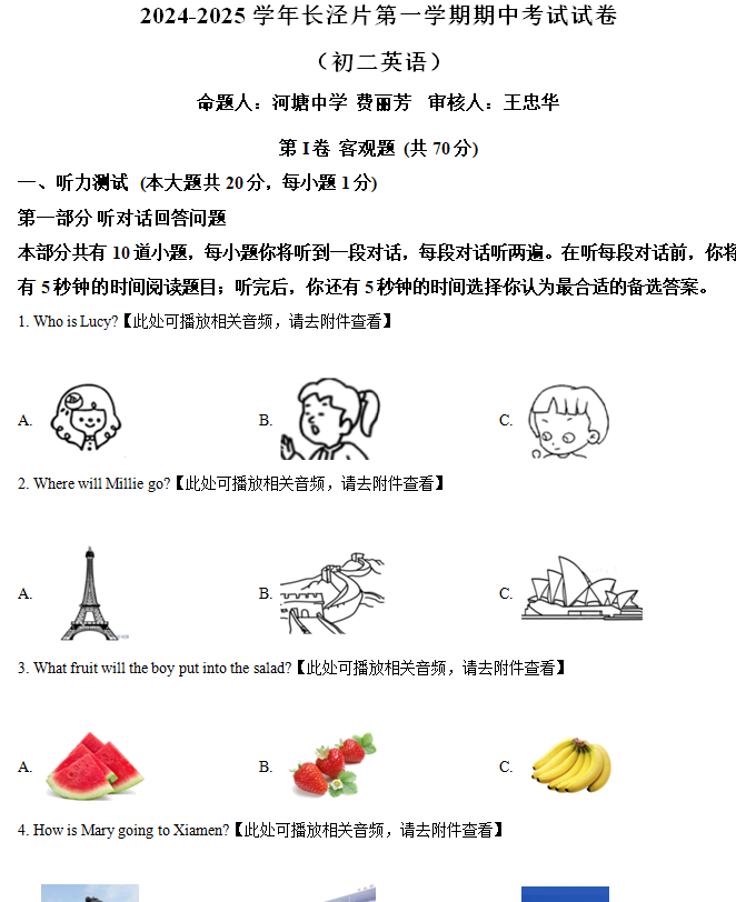 江苏100教学资源网 八上 江苏省无锡市江阴市长泾片2024-2025学年八年级上学期期中考试英语试题(含解析+听力音频) https://www.jiangsu100.com/15433.html