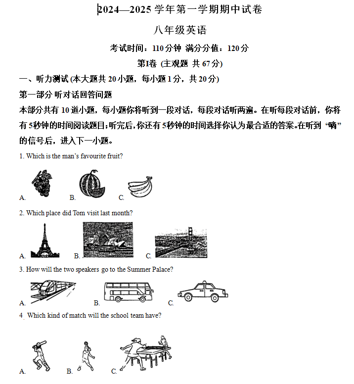 江苏100教学资源网 八上 江苏省无锡市英禾双语实验学校2024-2025学年八年级上学期期中考试英语试题(含解析) https://www.jiangsu100.com/15452.html