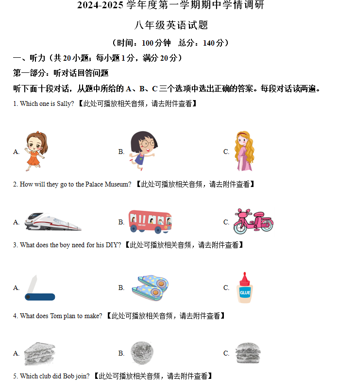 江苏100教学资源网 八上 江苏省徐州市邳州市2024-2025学年八年级上学期期中考试英语试题(含解析+听力音频) https://www.jiangsu100.com/15464.html