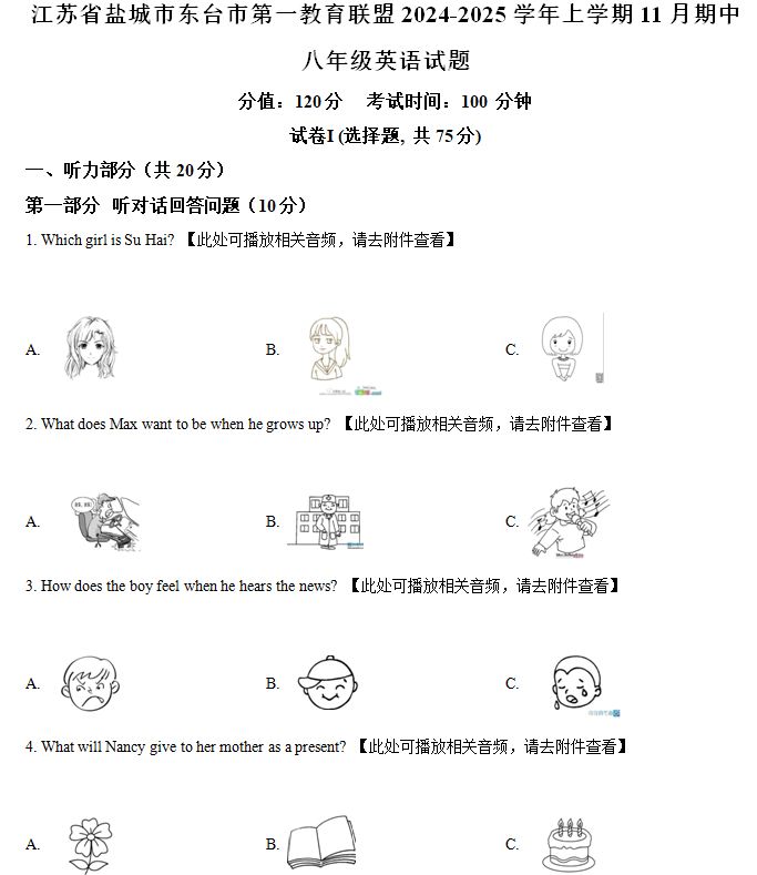江苏100教学资源网 八上 江苏省盐城市东台市第一教育联盟2024-2025学年八年级上学期期中英语试题(含解析+听力音频) https://www.jiangsu100.com/15479.html
