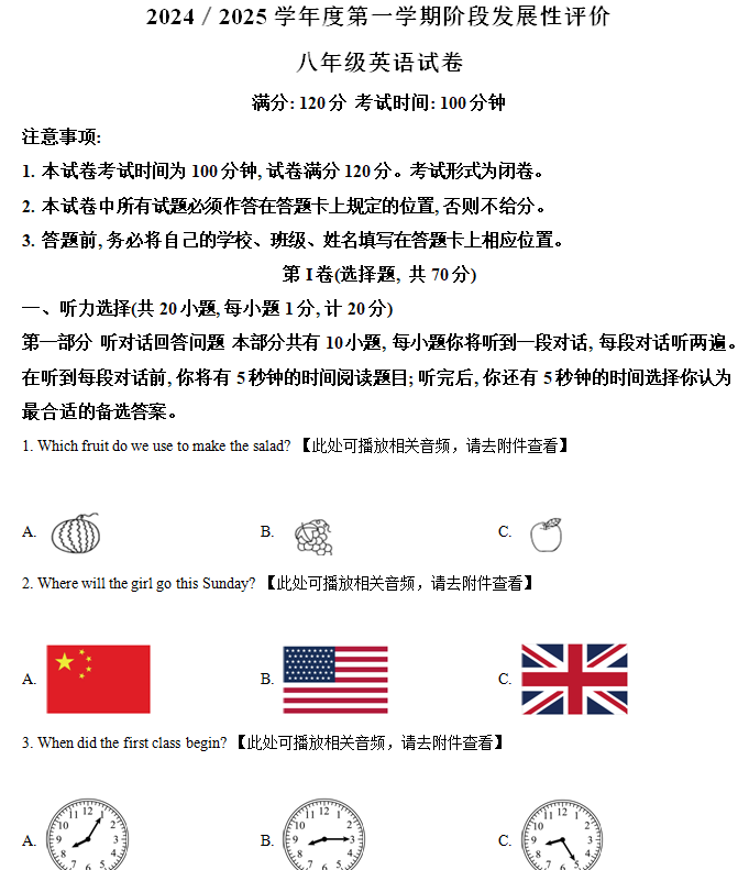 江苏100教学资源网 八上 江苏省盐城市盐都区2024-2025学年八年级上学期11月期中考试英语试题(含解析+听力音频) https://www.jiangsu100.com/15494.html