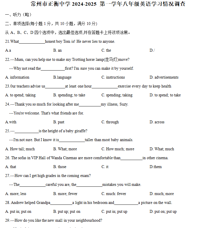 江苏省常州市正衡中学2024-2025学年八年级上学期期中测试英语试卷(含答案) 江苏省常州市正衡中学2024-2025学年八年级上学期期中测试英语试卷(含答案)