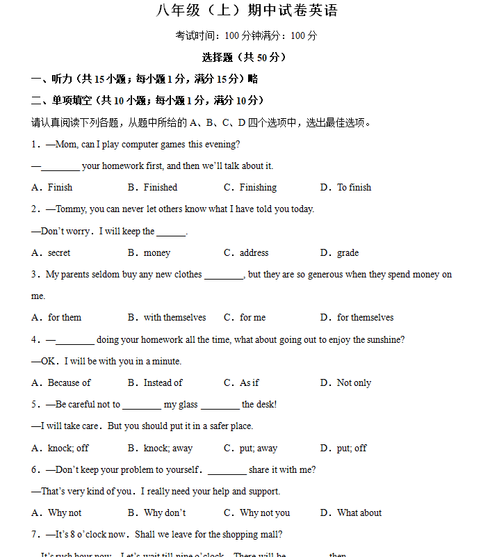 - 江苏省南通市2024-2025学年八年级上学期英语期中测试卷(含答案) 2025-10-12