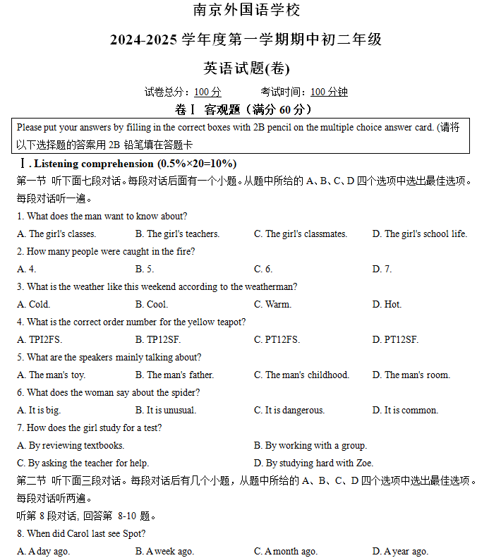 江苏100教学资源网 八上 江苏省南京外国语学校2024-2025学年八年级上学期期中考试英语试题(含答案) https://www.jiangsu100.com/15571.html