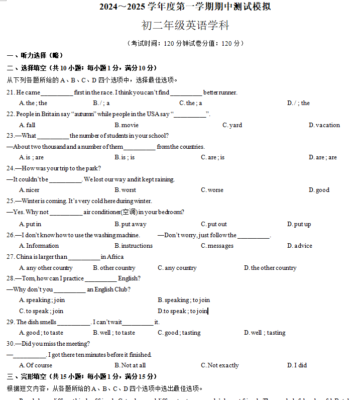 江苏100教学资源网 八上 江苏省宿迁市沭阳县外国语中学2024-2025学年八年级上学期期中模拟英语试题(含解析) https://www.jiangsu100.com/15574.html