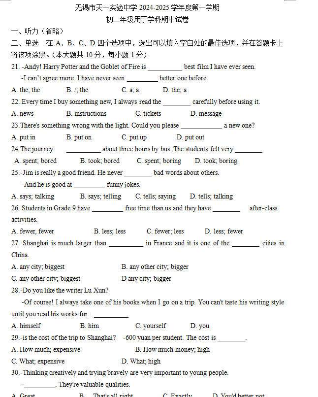 江苏100教学资源网 八上 江苏省无锡市天一实验中学2024-2025学年八年级上学期期中考试英语试卷(含答案) https://www.jiangsu100.com/15580.html