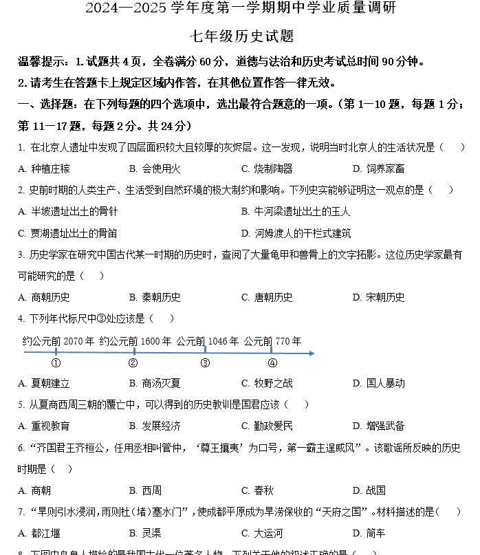 江苏100教学资源网 七上 江苏省连云港市连云区2024-2025学年七年级上学期期中历史试题(含解析) https://www.jiangsu100.com/15598.html