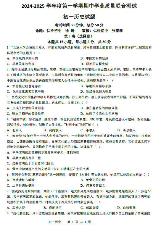 - 江苏省无锡市江阴市橙西片2024-2025学年七年级上学期期中考试历史试题(含答案) 2025-10-12