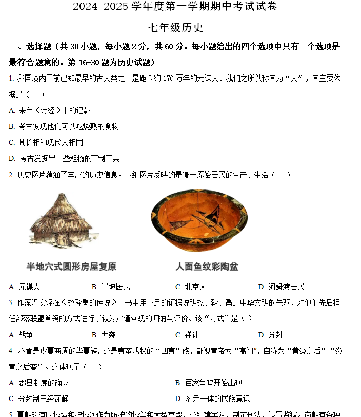 江苏100教学资源网 七上 江苏省南通市海门区2024-2025学年七年级上学期期中历史试题(含解析) https://www.jiangsu100.com/15622.html