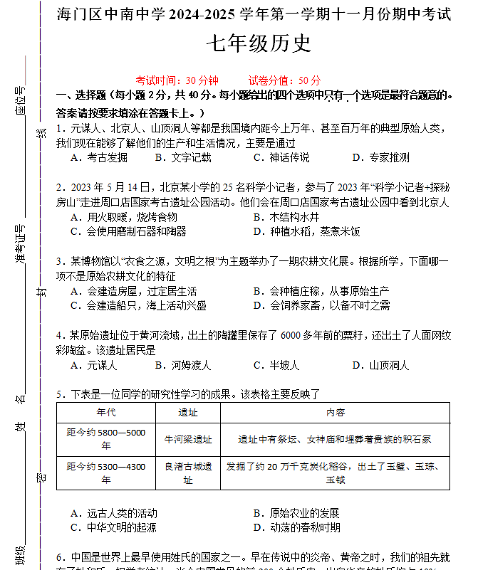 - 江苏省南通市海门区中南中学2024–2025学年部编版七年级历史上学期11月份期中考试题(含答案) 2025-10-12
