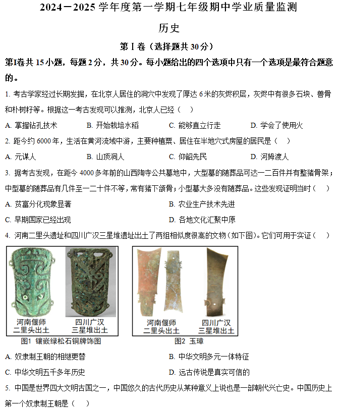 江苏100教学资源网 七上 江苏省南通市如皋市2024-2025学年七年级上学期期中历史试题(含解析) https://www.jiangsu100.com/15628.html
