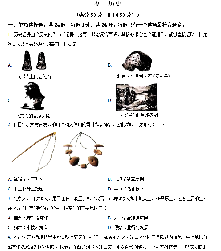 江苏100教学资源网 七上 江苏省苏州市四市联考2024-2025学年七年级上学期期中历史试题(含解析) https://www.jiangsu100.com/15637.html