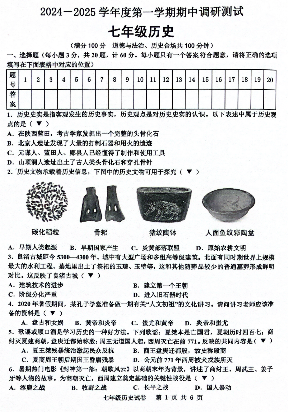 江苏100教学资源网 七上 江苏省宿迁市宿城区2024-2025学年七年级上学期11月期中历史试题(含答案) https://www.jiangsu100.com/15646.html