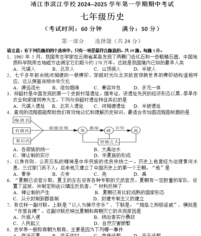 - 江苏省泰州市靖江市滨江学校2024-2025学年七年级上学期期中考试历史试卷(含答案) 2025-10-12