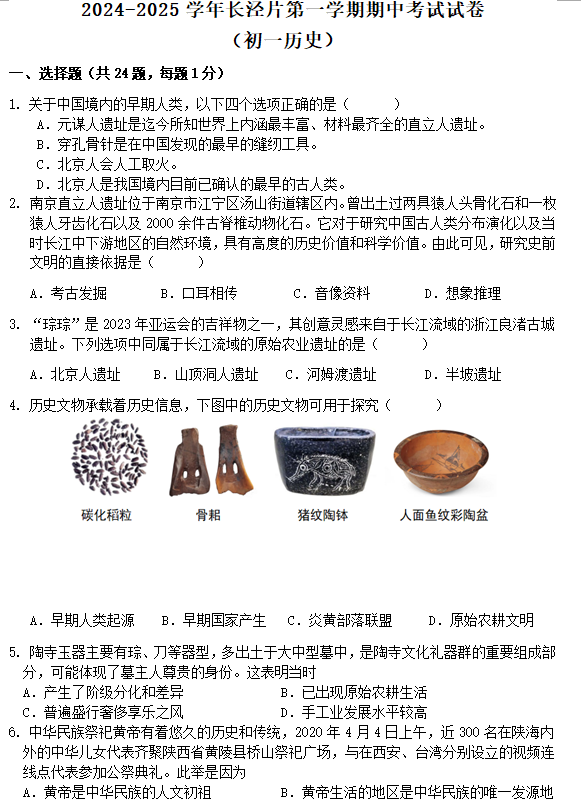 江苏100教学资源网 七上 江苏省无锡市江阴市长泾片2024-2025学年七年级上学期期中考试历史试题(含答案) https://www.jiangsu100.com/15685.html