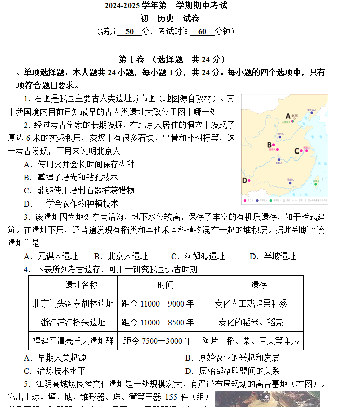 江苏100教学资源网 七上 江苏省无锡市江阴市直属片区2024-2025学年部编版七年级上学期11月期中历史试题(含答案) https://www.jiangsu100.com/15688.html