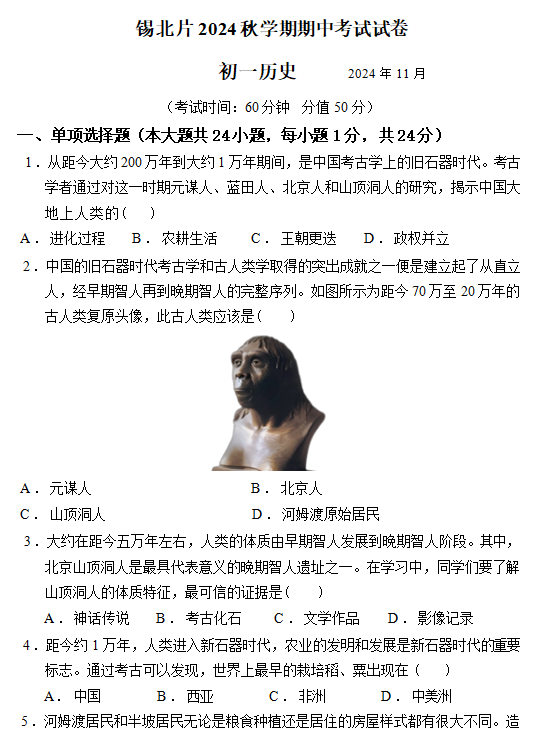 江苏100教学资源网 七上 江苏省无锡市锡北片区2024-2025学年七年级上学期期中考试历史试题(含答案) https://www.jiangsu100.com/15694.html