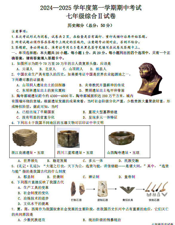 江苏100教学资源网 七上 江苏省盐城市东台实验中学教育集团2024-2025学年七年级上学期期中历史试题(含答案) https://www.jiangsu100.com/15712.html