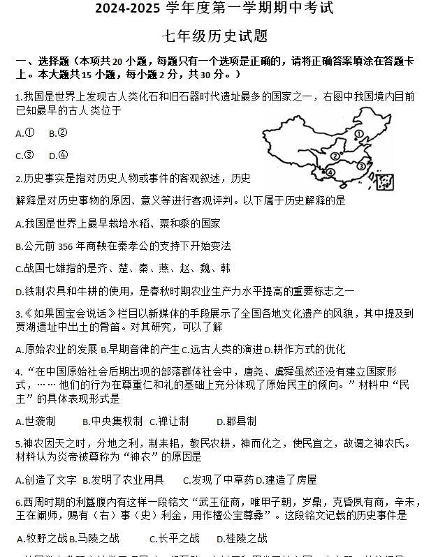 江苏100教学资源网 七上 江苏省盐城市建湖县2024-2025学年七年级上学期11月期中历史试题(含答案) https://www.jiangsu100.com/15718.html