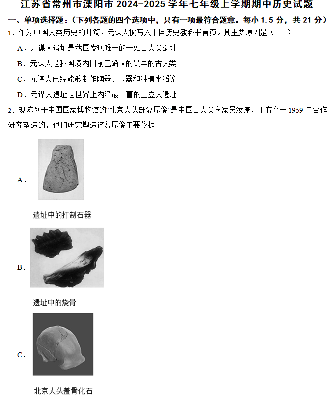 江苏100教学资源网 七上 江苏省常州市溧阳市2024-2025学年七年级上学期期中历史试题(含答案) https://www.jiangsu100.com/15727.html