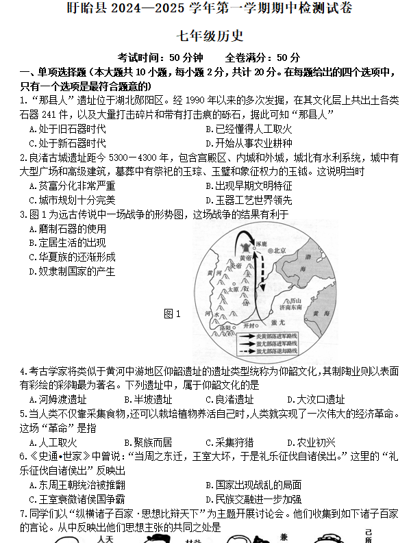 江苏100教学资源网 七上 江苏省淮安市盱眙县2024-2025学年部编版七年级历史上学期期中考试卷(含答案) https://www.jiangsu100.com/15739.html