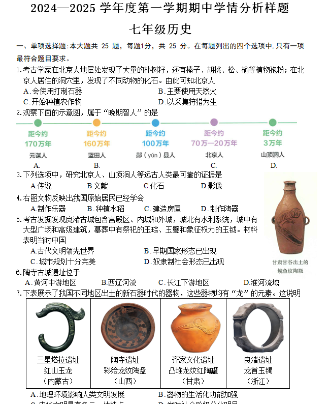 江苏100教学资源网 七上 江苏省南京市雨花台中学2024-2025学年部编版七年级历史上学期期中学情分析样题(含答案) https://www.jiangsu100.com/15748.html