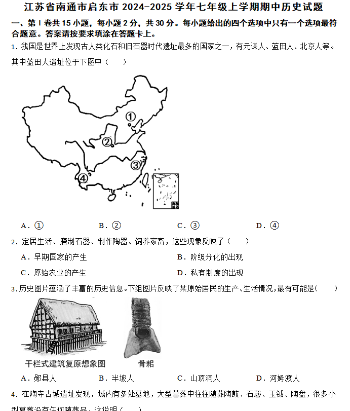 江苏100教学资源网 七上 江苏省南通市启东市2024-2025学年七年级上学期期中历史试题(含答案) https://www.jiangsu100.com/15754.html